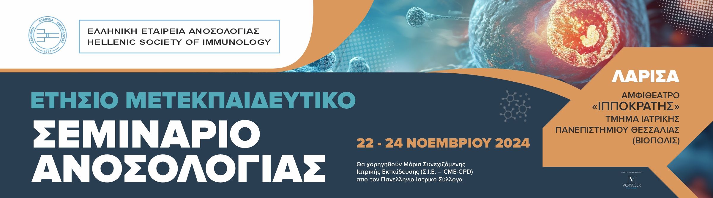Το Δ.Σ. της Ελληνικής Εταιρείας Ανοσολογίας (Ε.Ε.Α.) με ιδιαίτερη χαρά σας καλωσορίζει ο στο Ετήσιο Μετεκπαιδευτικό Σεμινάριο Ανοσολογίας 2024, το οποίο φέτος πραγματοποιείται στη Λάρισα δια ζώσης, με ταυτόχρονη διαδικτυακή παρακολούθηση, από 22 έως 24 Νοεμβρίου 2024, στο Αμφιθέατρο «ΙΠΠΟΚΡΑΤΗΣ» της Ιατρικής Σχολής Επιστημών Υγείας του Πανεπιστημίου Θεσσαλίας, στα πλαίσια της αδιάλειπτης επιστημονικής ενημέρωσης στον τομέα της Ανοσολογίας.