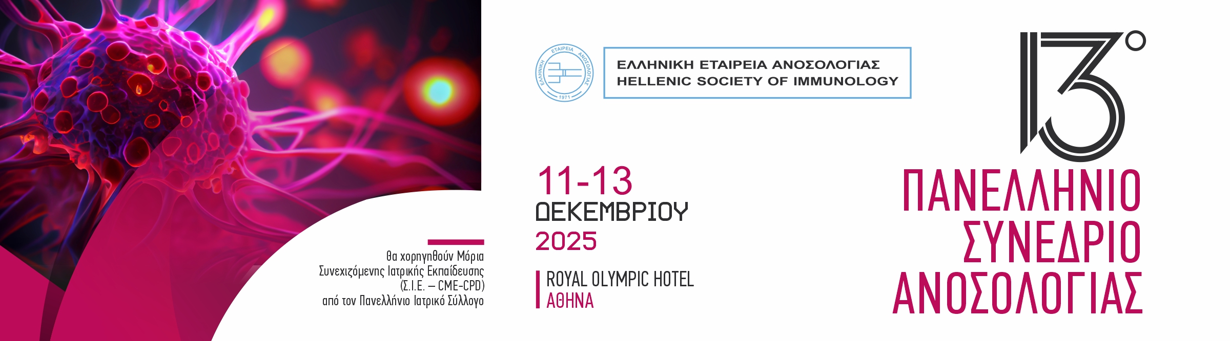 Με ιδιαίτερη τιμή και χαρά σας προσκαλώ εκ μέρους της Οργανωτικής και Επιστημονικής Επιτροπής, στο 13ο Πανελλήνιο Συνέδριο Ανοσολογίας που διοργανώνει η Ελληνική Εταιρεία Ανοσολογίας (Ε.Ε.Α.) στις 11-13 Δεκεμβρίου 2025 στην Αθήνα (Ξενοδοχείο Royal Olympic).